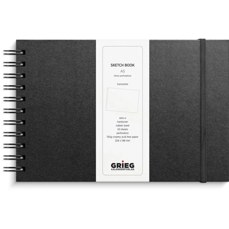 Det solide coveret og strikk som samler omslagene gjør at boken tåler mye og tegningene ivaretas. Kunstskinn harcover omslag Spiralisert rygg Strikk for lukking Perforert livekant på arkene 15g kremfarget papir Syrefritt papir 50 blad, 100 sider.