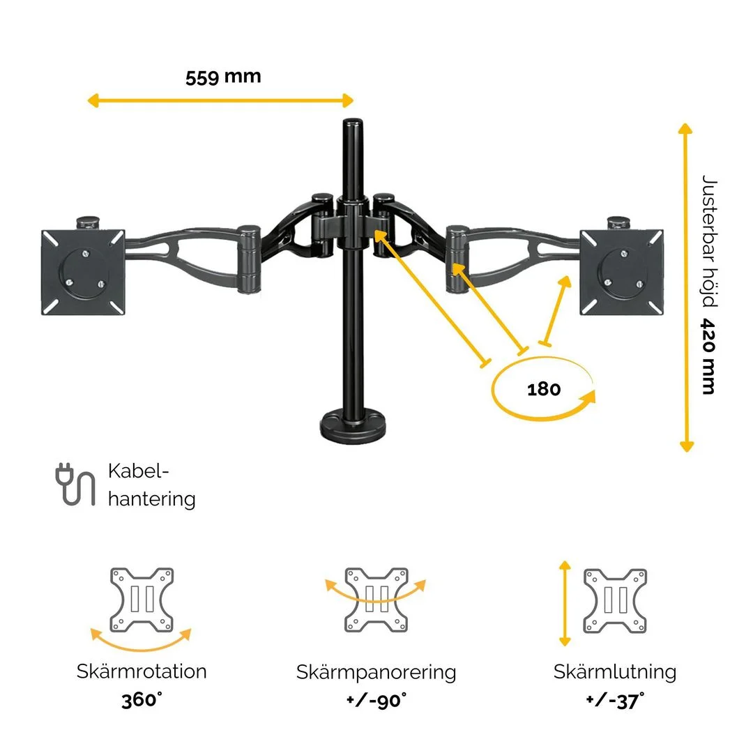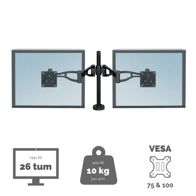 Armene er fremstilt av aluminiumsrør som du kan gjemme kablene i. Tar opp et minimum av bordplass Justerbar skjermarm til to skjermer for den beste betraktningsvinkelen Kan bære en LCD-skjerm på opptil 10 kg (32»-skjerm) Fremstilt av aluminiumsrør som du kan gjemme kabler og ledninger i.