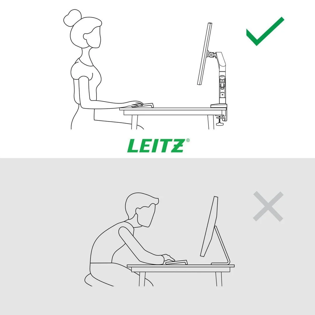 Leitz Ergo plassbesparende dobbel skjermarm Leitz plassbesparende skjermarm har en positiv innvirkning på kroppsholdningen, fremmer riktig øyejustering og støtter nakke- og skulderkomfort når høyden på skjermene er justert riktig, og som anbefalt, til den ideelle ergonomiske posisjonen. Skjermene forblir stabile i alle høyder og vinkler og kan enkelt byttes mellom liggende og portrettmodus. Dens design er ideell der det er begrenset plass, og det vil frigjøre verdifull plass på skrivebordet.
