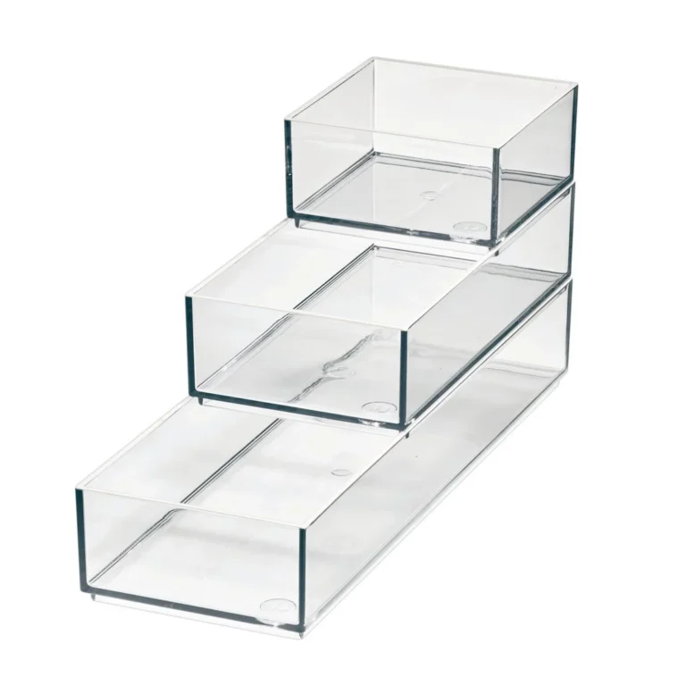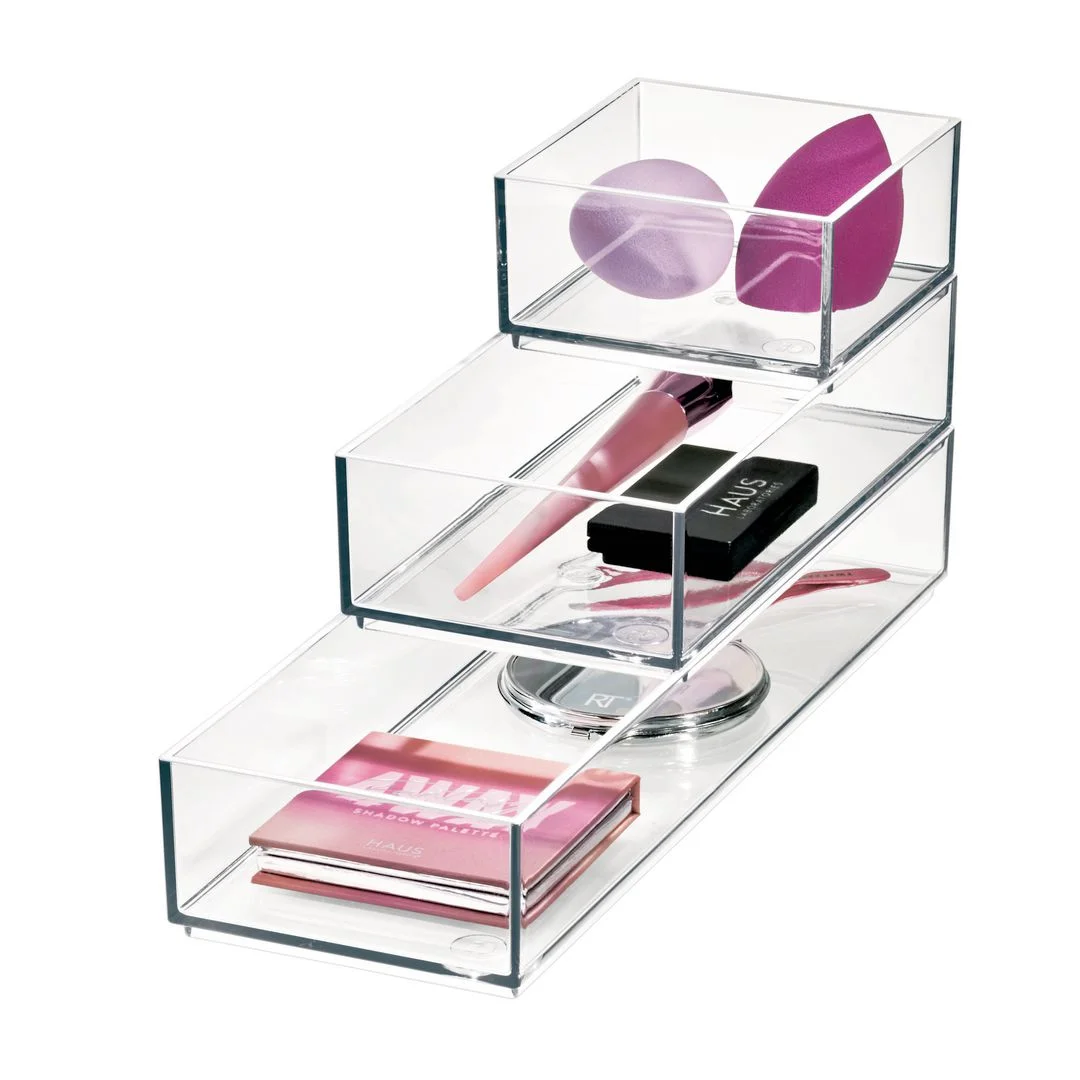 Sett med tre ulike størrelser, designet for å stable og sitte perfekt med hverandre, slik at du kan lagre paletter, pudder, liners, leppestifter og andre produkter raskt og effektivt, praktisk stablet oppå hverandre. Den åpne toppen og de gjennomsiktige sidene gjør det raskt og enkelt å identifisere de produktene du skulle behøve.