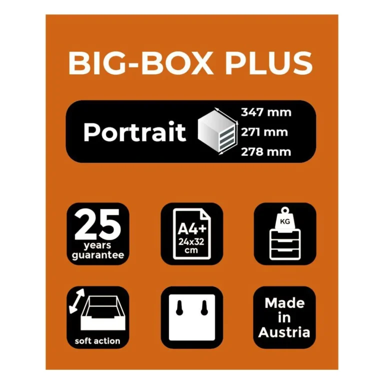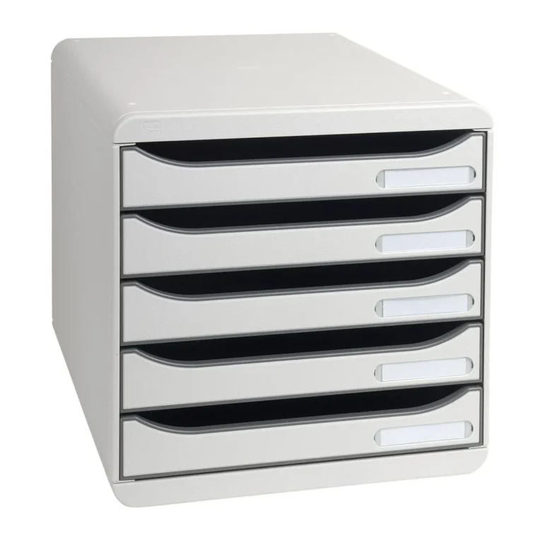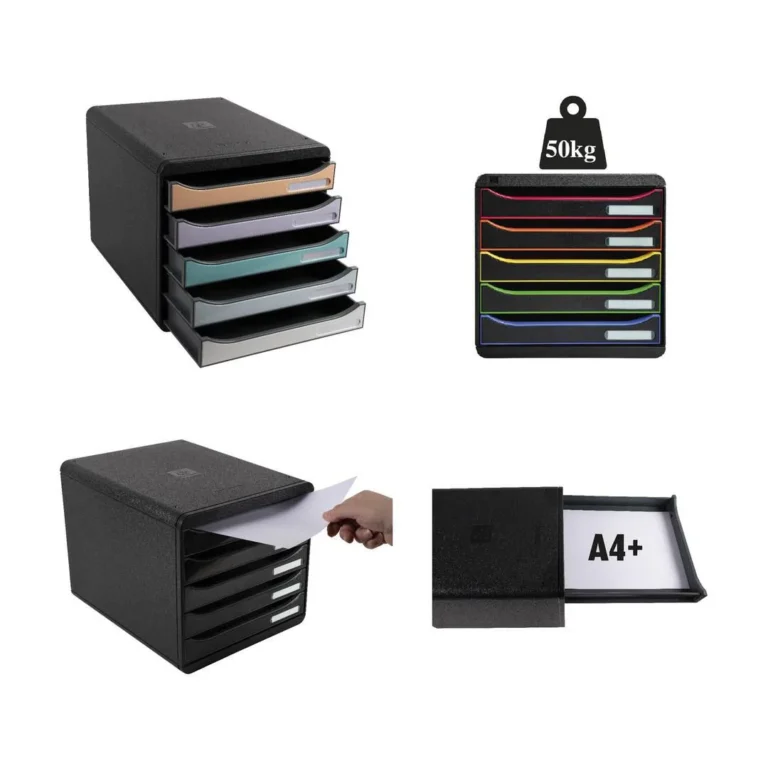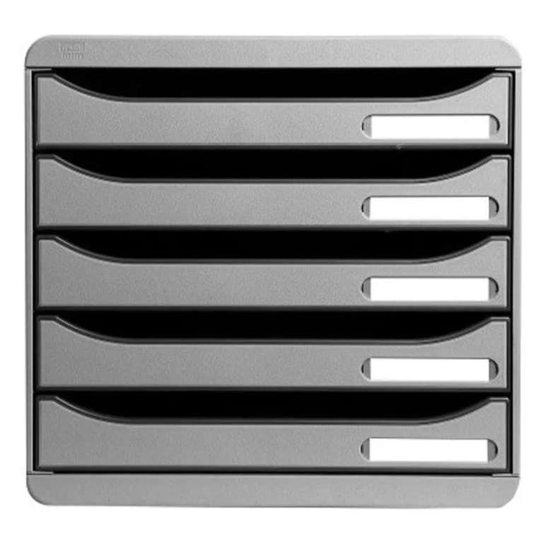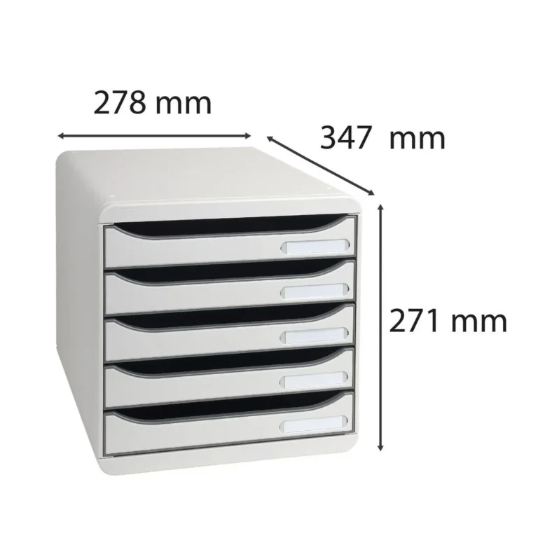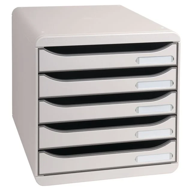 Exacompta BIG-BOX PLUS skuffekabinett med 5 skuffer. Skuffekabinett med 5 skuffer, hver 43 mm høy, for oppbevaring av A4+ dokumenter. Hus i ett stykke som tillater høy belastning. Åpne skuffer gjør det mulig å lagre dokumenter uten å åpne dem.