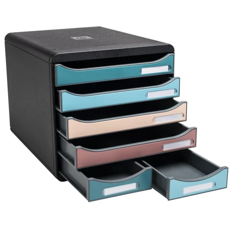 Skuffenes åpne front gjør det enkelt å skyve dokumentene direkte på plass. Skuffene er også designet for å være behagelige i bruk, med en jevn og stillegående bevegelse, samt en sikkerhetsstopper for å forhindre uønsket åpning. Du kan enkelt stable flere moduler oppå hverandre takket være de fire hakkene som sikrer stabiliteten. Skuffenes åpne design gir deg muligheten til å arkivere dokumenter uten å måtte åpne dem, og den jevne bevegelsen sikrer enkel tilgang til innholdet. Romslig Organisering: 6 skuffer, 4 store og 2 små for A4- og A4+-dokumenter Åpen Front: Enkel direkte innsetting av dokumenter Stillegående: Skuffene glir jevnt og er utstyrt med sikkerhetsstopper Stablingsmulighet: 4 hakk for enkel og stabil stabling.