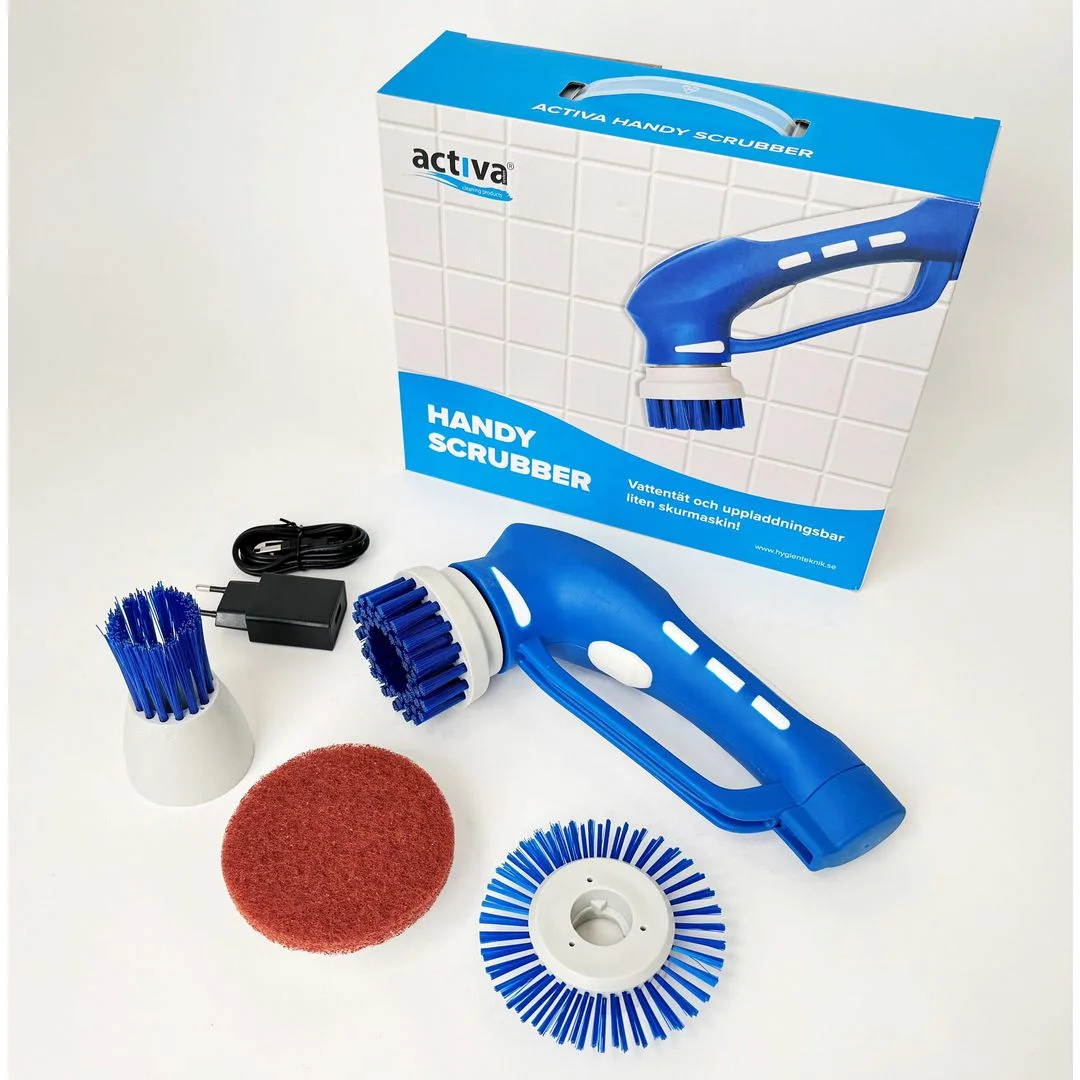 og er kraftig nok til å rengjøre større flater som badekar og arbeidsbenker. Activa Handy Scrubber leveres med 3 forskjellige børster, en skurepad , batteri og lader. Oppladbart batteri: Li-ion 3,6V 2600mAh.