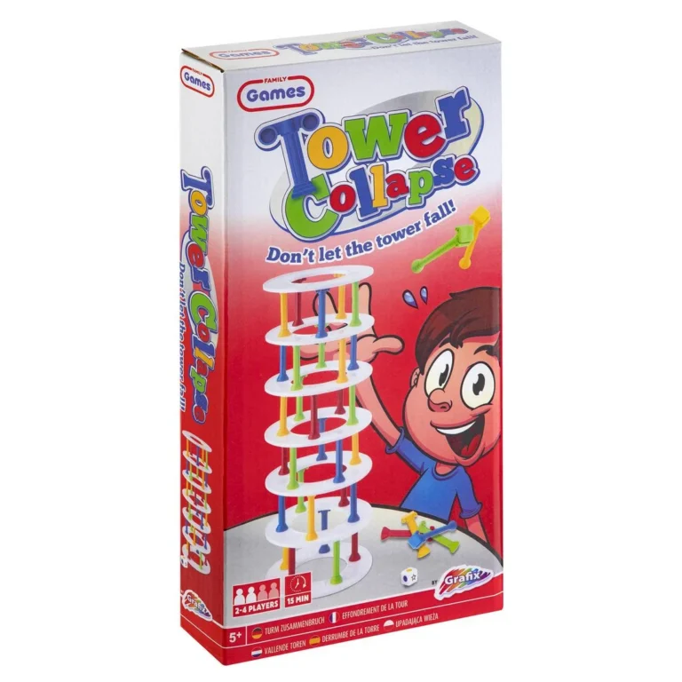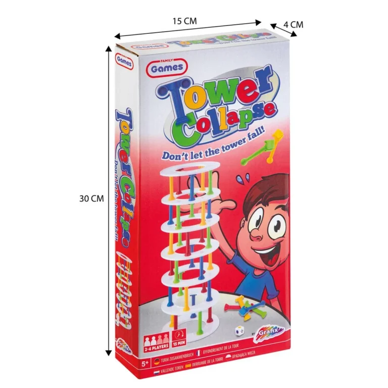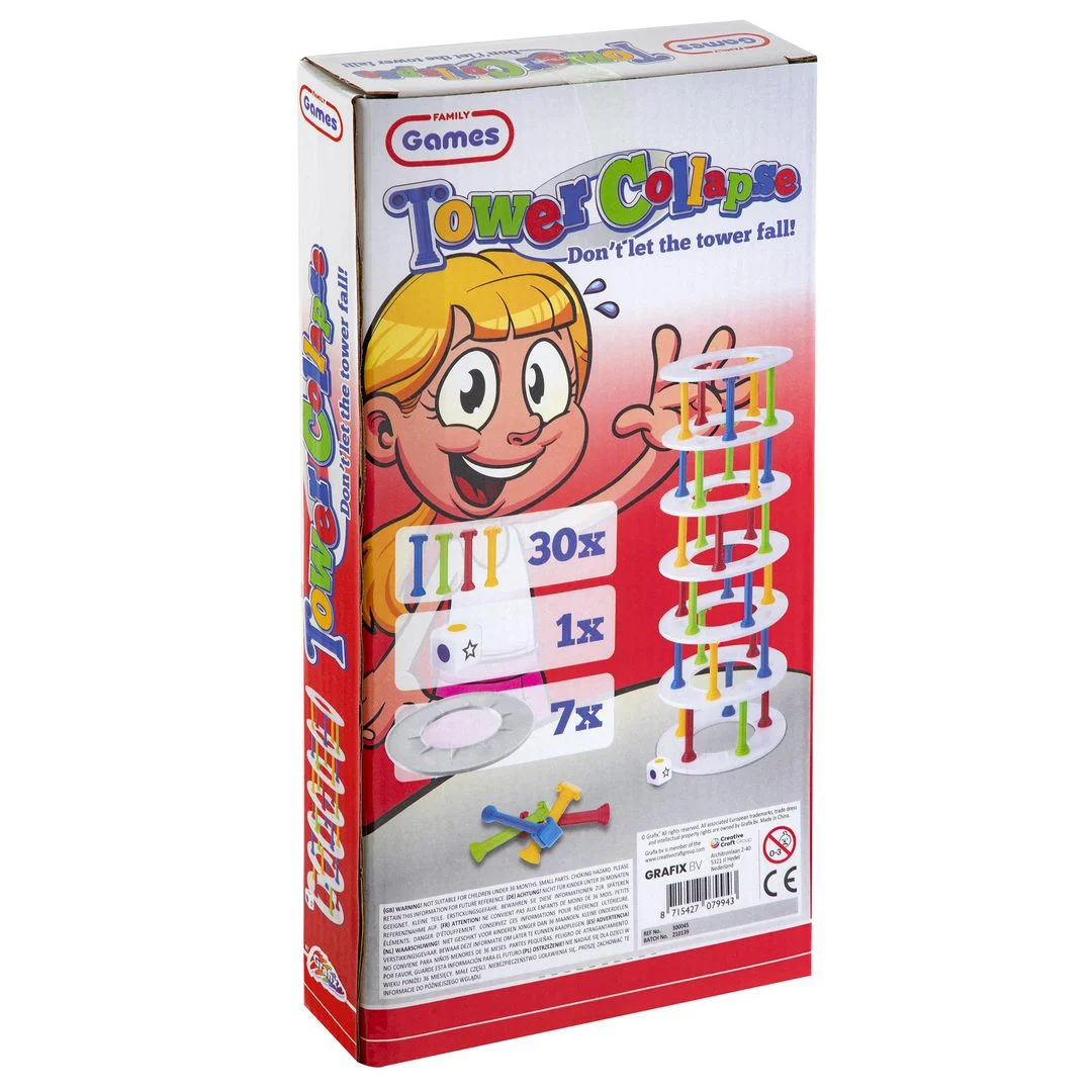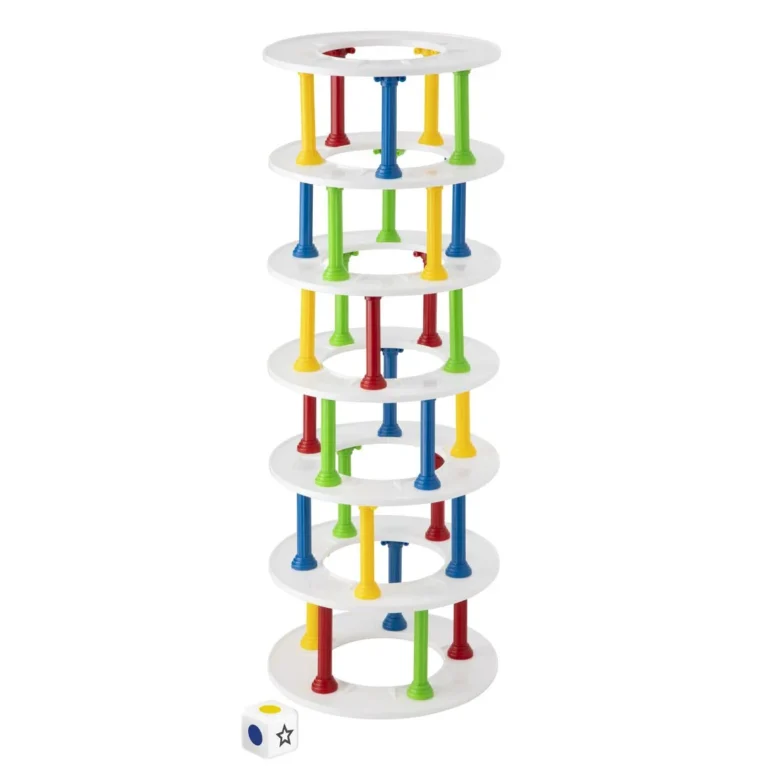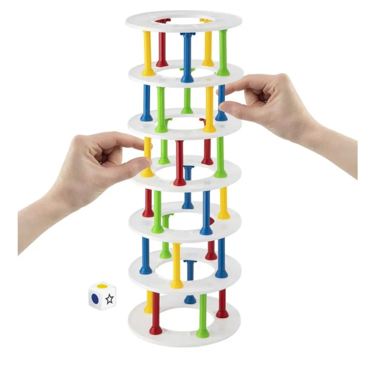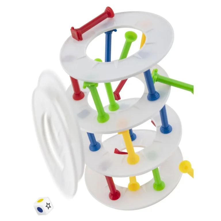 Bygg tårn og unngå at det faller sammen! Bygg tårn og unngå at det faller sammen! Inneholder 30 pilarer i 4 farger, 7 ringer og en terning.