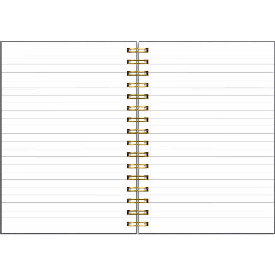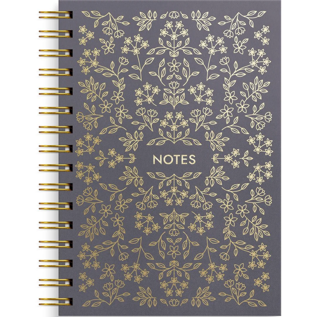 Det matt sorte kartongomslaget med gullblomster kombinert med en gullspiral gir boken et stilrent og elegant uttrykk. Det praktiske A5-formatet gjør den enkel å ta med seg overalt, enten du skal føre notater, skrive lister eller la kreativiteten flyte fritt. Fin og liten linjert spiralbok Kartongomslag med blomster motiv.