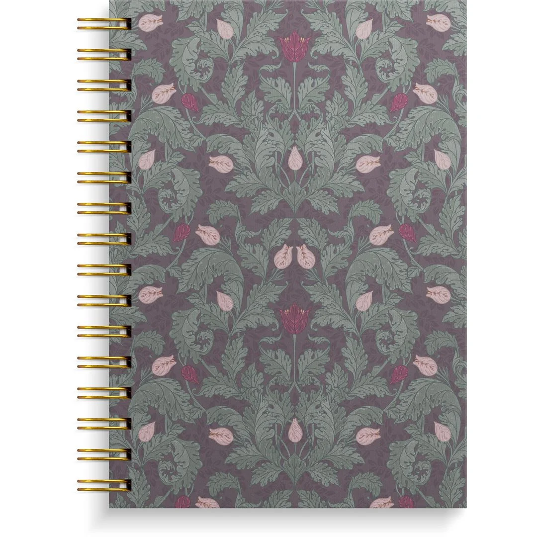 Skrivebok linjert med omslag i trykket kartong. Spiralisert skrivebok i matt burgunder kartongomslag og gull spiral. En god følgesvenn for dine notater.