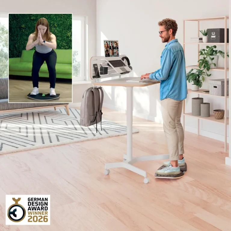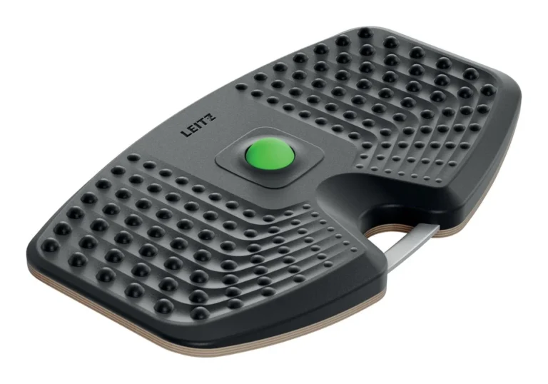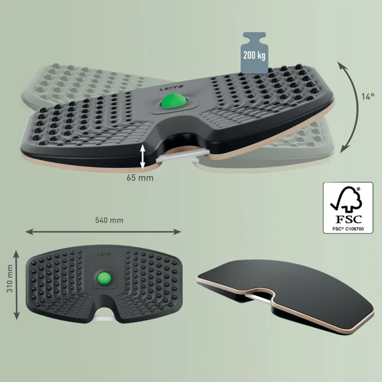 Hold deg aktiv og føl deg bra med Leitz Ergo Active balansebrett. Forbedre holdningen din, bidra til å redusere ryggsmerter og øke energinivået med Leitz Ergo balansebrett av høy kvalitet. Designet for bruk sammen med hev/senk skrivebord. Dette førsteklasses balansebrettet har en balansert 14° tilt som oppmuntrer til naturlige mikrobevegelser, og hjelper til med å engasjere kjernemuskulaturen og bena mens du jobber. Regelmessig bruk av dette balansebrettet med lav effekt kan styrke kjernemuskulaturen, forbedre balansen og fremme bedre sirkulasjon, og det er testet og sertifisert av det tyske instituttet for helse og ergonomi (IGR). Det er ideell for lange timer med stående og sittende arbeid, også smart under teams møter og videokonferanser for å redusere fottretthet, forbedre holdningen og holde deg våken hele dagen. Massasjeoverflaten støtter leddene og musklene. Massasjeballen kan tas ut og brukes til målrettet lindring for føtter, håndledd og skuldre. Slitesterk FSC-sertifisert trebase med anti-skli design for å god sikkerhet. Dette brettet er kompakt i størrelse og er lett å bære og oppbevare når det ikke er i bruk. Den kan også plasseres under skrivebordet for en beroligende vipping mens du sitter, holder føttene aktive selv under lange sitteperioder. Den minimalistiske designen passer sømløst inn i hjemmet, kontoret eller treningsstudioet, og det innebygde aluminiumshåndtaket gjør det enkelt å transportere og henge opp. Øk produktiviteten, komforten og generell velvære med Leitz.