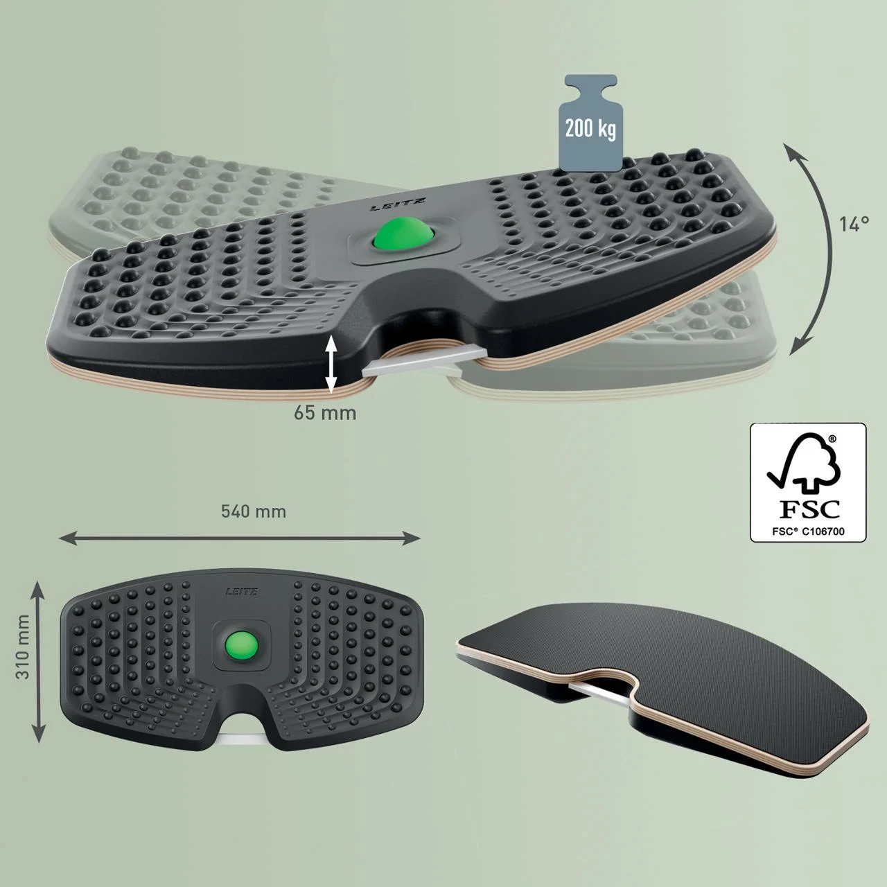 Hold deg aktiv og føl deg bra med Leitz Ergo Active balansebrett. Forbedre holdningen din, bidra til å redusere ryggsmerter og øke energinivået med Leitz Ergo balansebrett av høy kvalitet. Designet for bruk sammen med hev/senk skrivebord. Dette førsteklasses balansebrettet har en balansert 14° tilt som oppmuntrer til naturlige mikrobevegelser, og hjelper til med å engasjere kjernemuskulaturen og bena mens du jobber. Regelmessig bruk av dette balansebrettet med lav effekt kan styrke kjernemuskulaturen, forbedre balansen og fremme bedre sirkulasjon, og det er testet og sertifisert av det tyske instituttet for helse og ergonomi (IGR). Det er ideell for lange timer med stående og sittende arbeid, også smart under teams møter og videokonferanser for å redusere fottretthet, forbedre holdningen og holde deg våken hele dagen. Massasjeoverflaten støtter leddene og musklene. Massasjeballen kan tas ut og brukes til målrettet lindring for føtter, håndledd og skuldre. Slitesterk FSC-sertifisert trebase med anti-skli design for å god sikkerhet. Dette brettet er kompakt i størrelse og er lett å bære og oppbevare når det ikke er i bruk. Den kan også plasseres under skrivebordet for en beroligende vipping mens du sitter, holder føttene aktive selv under lange sitteperioder. Den minimalistiske designen passer sømløst inn i hjemmet, kontoret eller treningsstudioet, og det innebygde aluminiumshåndtaket gjør det enkelt å transportere og henge opp. Øk produktiviteten, komforten og generell velvære med Leitz. Gyngebevegelser holder bena og kjernemuskulaturen i bevegelse for å forbedre holdningen og redusere ryggsmerter som kan oppstå etter lengre perioder med stående eller sittende arbeid Regelmessig bruk av Ergo balansebrett kan styrke kjernemuskulaturen og forbedre balansen og koordinasjonen. som igjen kan ha en positiv innvirkning din generelle velvære Perfekt balansert med en 14° vinklet tilt, for å skape naturlige og effektive mikrobevegelser som gir en skånsom,