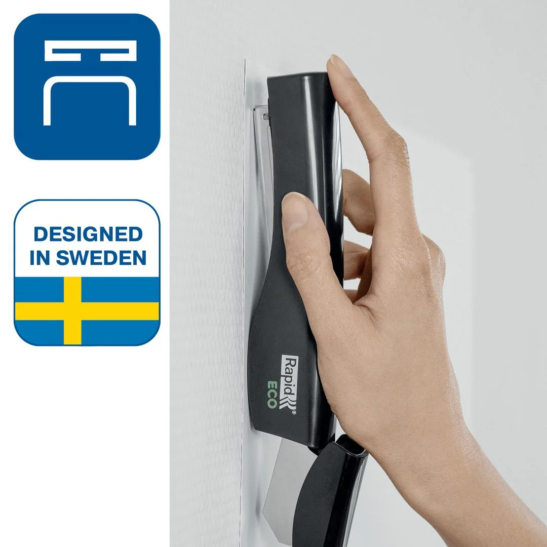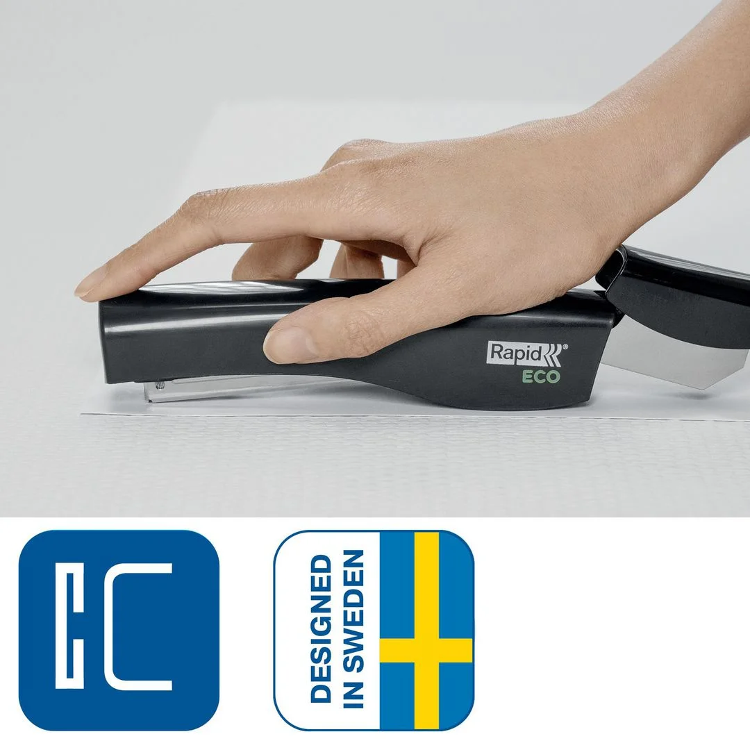 Stifter opptil 25 ark (80g) med presisjon. SuperFlatClinch-teknologi reduserer papirbunker med 40 %. Kompakt stående design sparer plass. Enkel toppfylling av stifter. 5 års garanti ved bruk av Rapid-stifter.