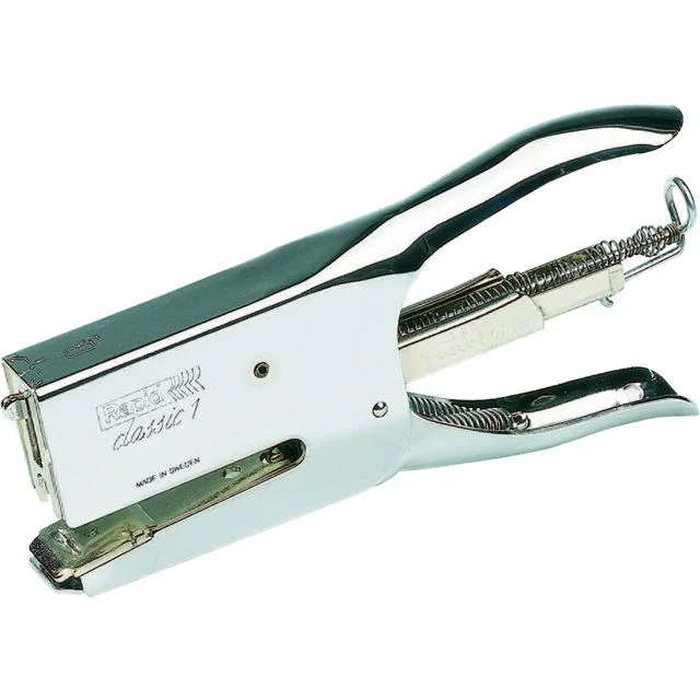 Stift enkelt sammen opptil 50 ark med denne Rapid Classic K1-stiftetangen. Disse stengene har en enkel og lekker sølvdesign med en roterende ambolt som kan justeres for stifting eller festing. Den har tradisjonell påfylling bak og innsettingsdybde på 56 mm.