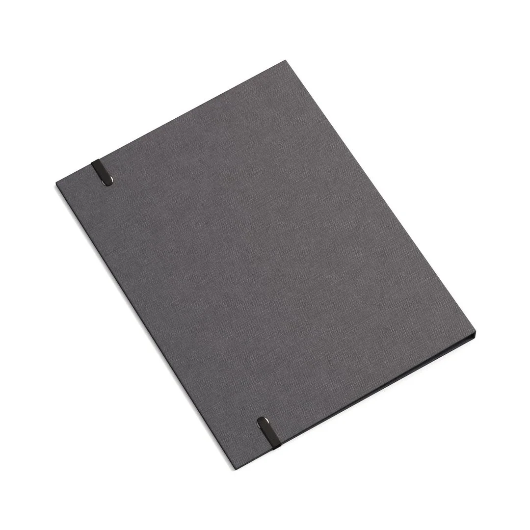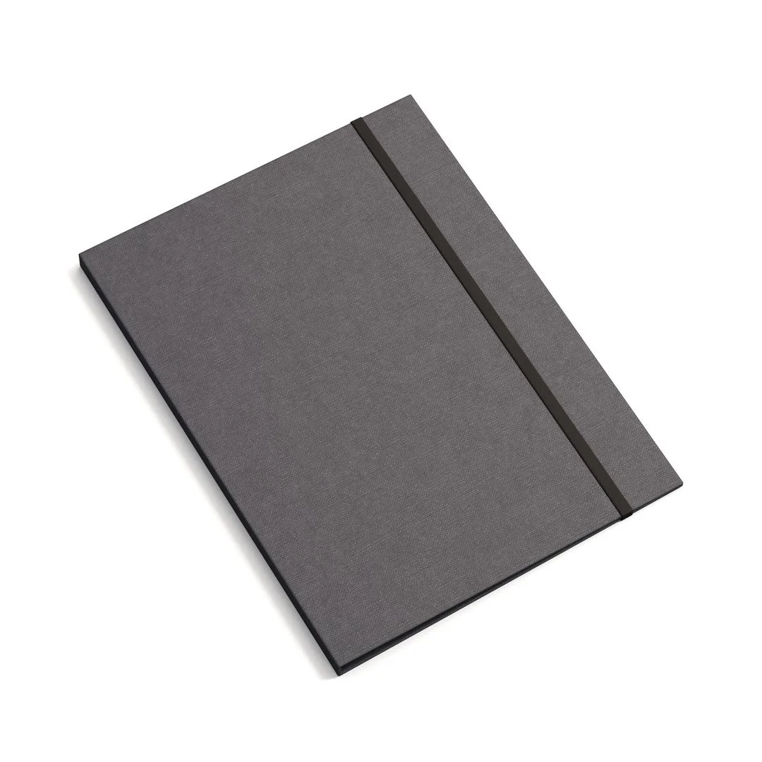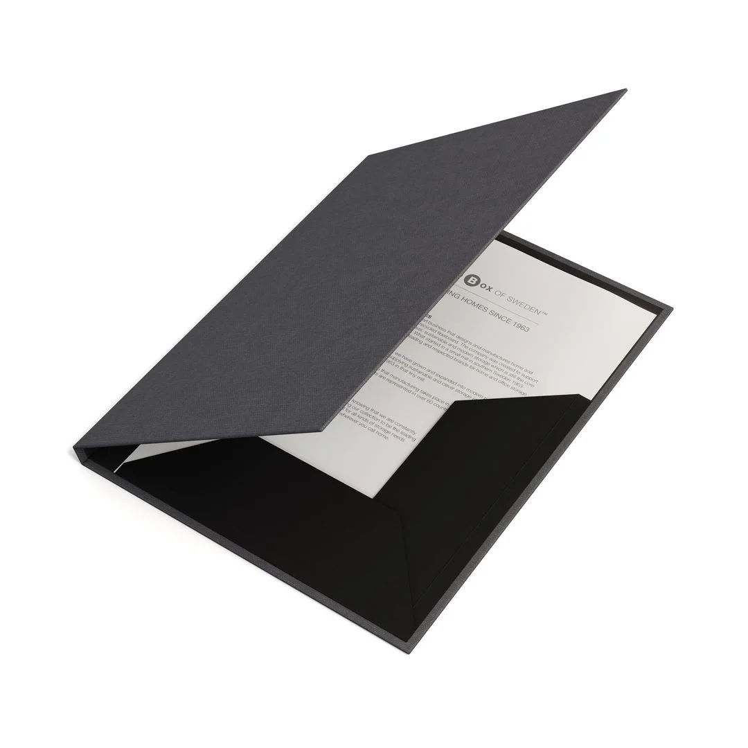 To lommer inni sikrer at papirene holder seg på plass, og strikken holder mappen lukket.