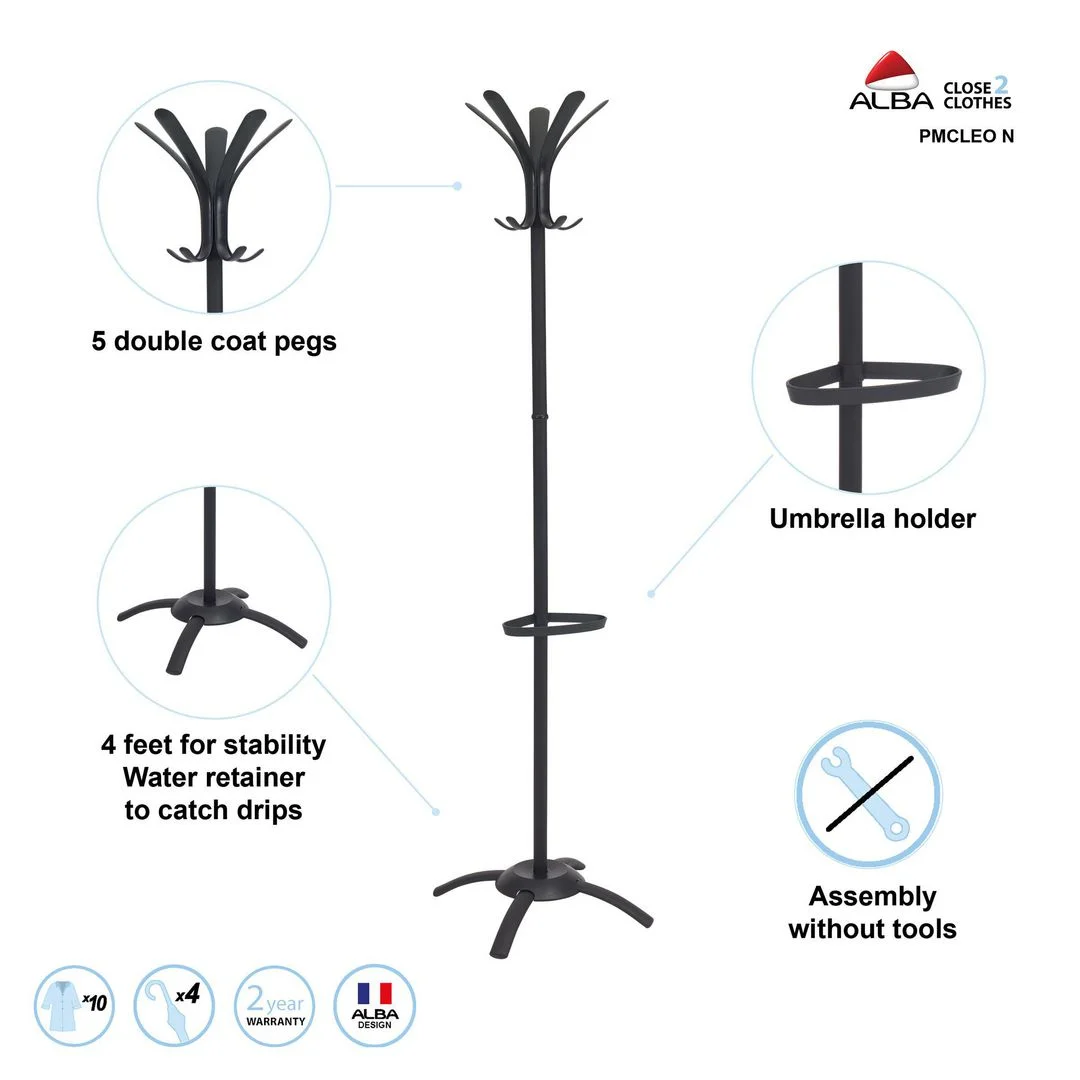 Alba-konseptet tilbyr en designinnovasjon som gir deg både funksjonalitet og stil på samme tid. Klesstativ med 10 kroker 175 cm høyt i sort farge Praktisk paraplyholder og krysset base Dryppbrett for å unngå søl.