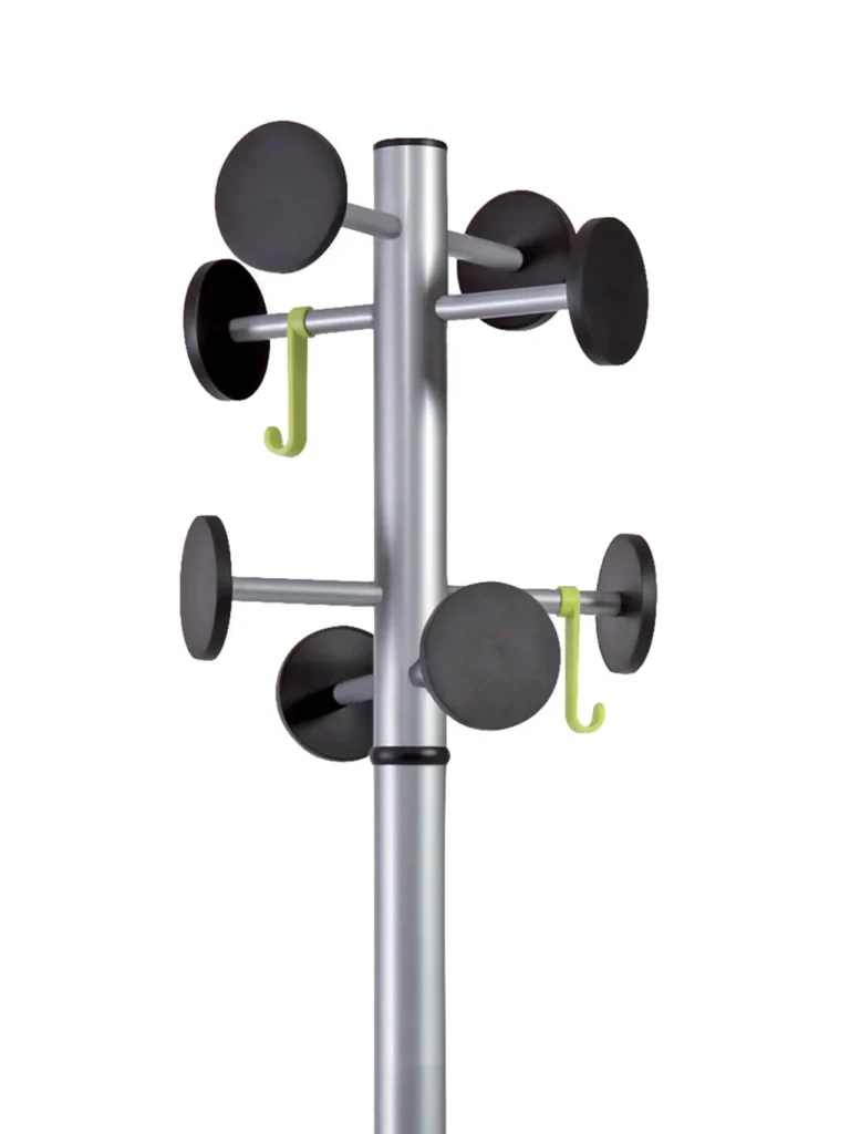 COAT STAND STAN3 kombinerer funksjonalitet og elegant design – perfekt for kontor, resepsjon eller hjemmet.Med åtte avrundede knagger og to ekstra kroker gir den rikelig plass til jakker, vesker og tilbehør, uten å skade stoffene. Den integrerte paraplyholderen rommer opptil seks paraplyer, har fire ekstra kroker og en praktisk vannoppsamler som holder gulvet tørt. Den robuste metallfoten på 5kg gir stabilitet, mens det smarte monteringssystemet lar deg sette den opp raskt uten verktøy. I tillegg leveres den i kompakt emballasje. – Praktisk stativ for klær og tilbehør – 8 knagger og 2 kroker – Integrert paraplyholder med vannoppsamler – Robust metallfot – Vekt matallfot: 5kg – Enkel montering uten verktøy – Farge: Sølvgrå
