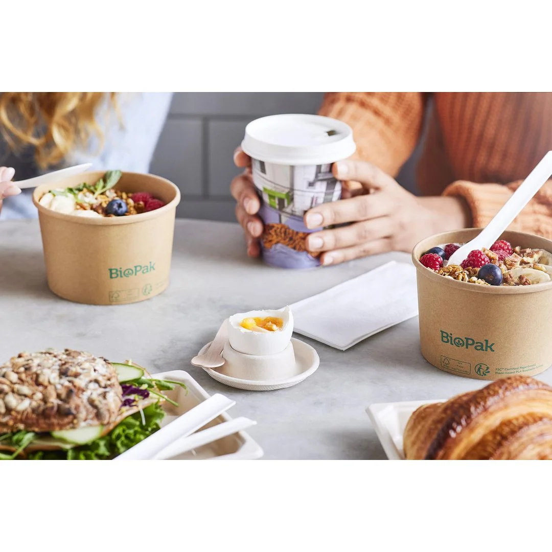 Beger i papp med plantebasert PLA-belegg, til bruk med både varm og kald mat. Materialet er fett- og vannavvisende, noe som gjør begeret velegnet til supper, gryteretter, pasta og lignende.