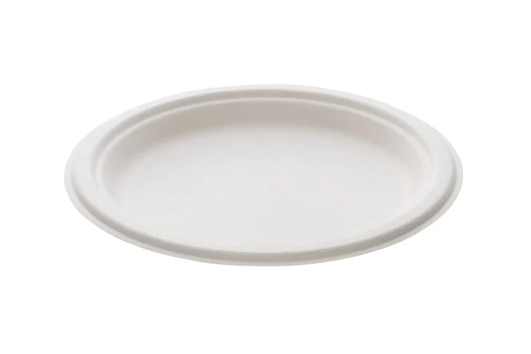 Stabil, hvit tallerken i bagasse, en plantebasert og fornybar ressurs.