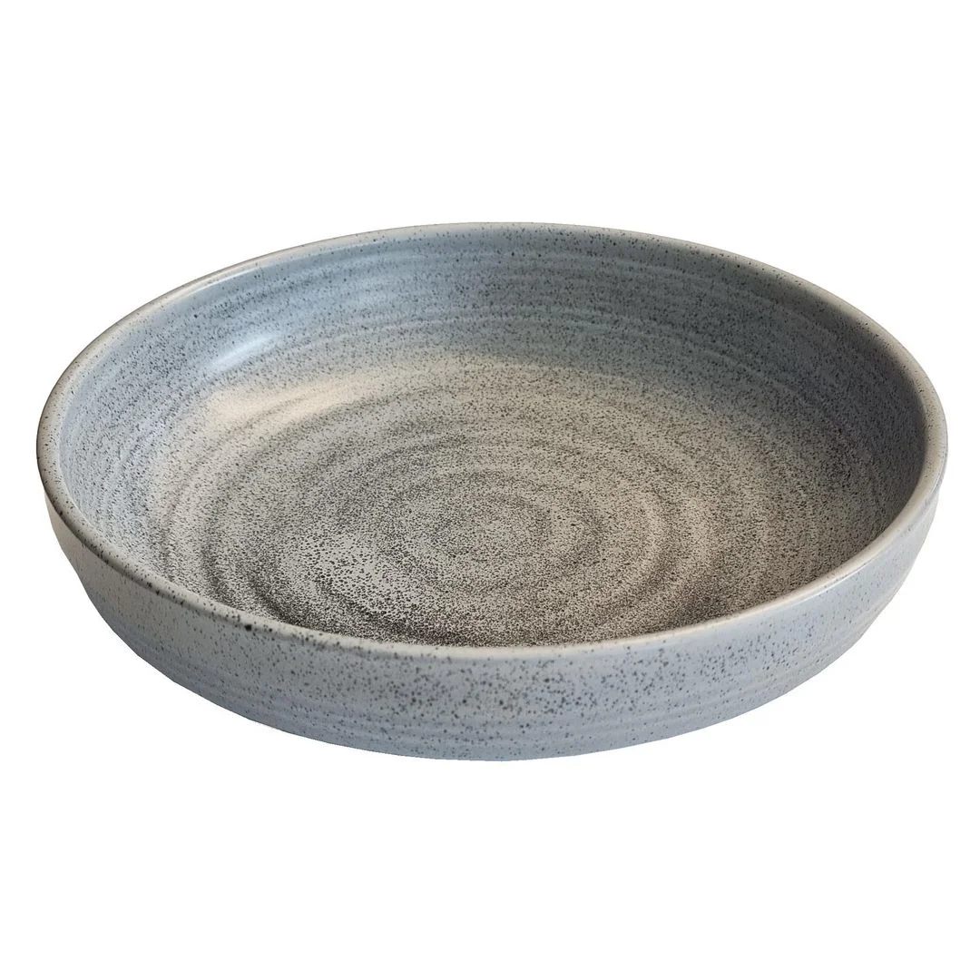 Dyp tallerken i steingods. Et kvalitetsservise som er like praktisk som det er vakkert. Serien er designet med fokus på styrke og holdbarhet, og er velegnet for storkjøkken-bruk. I denne serien brukes en reaktiv glasur som gir produktet en følelse av håndlaget utrykk, og gjør hvert produkt helt unikt. Steingods er gjenstander av brent leire med høyt innhold av kaolin. De har en gråaktig tone etter brenning i stedet for hvit, slik ren kaolin blir som porselen. Brenning foregår i ovner ved samme temperaturer som porselen. Ofte legges et lag farge-glasur utenpå, som vanligvis må brennes inn for seg. Bollen tåler temperaturer mellom -40°C og 250°C, og kan benyttes i ovn, mikrobølgeovn og fryser. Unngå hurtige temperaturforskjeller som å sette serviset rett fra fryser og inn i ovn. Oppvaskmaskinsikker. Følg maskinprodusentens retningslinjer for temperatur, skyllemidler og dosering for å sikre lang levetid for produktet. – Dyp tallerken i stengods – Volum: 70cl – Diameter: 200mm – Temperaturområde: -40°C til +250°C – Farge: Grå