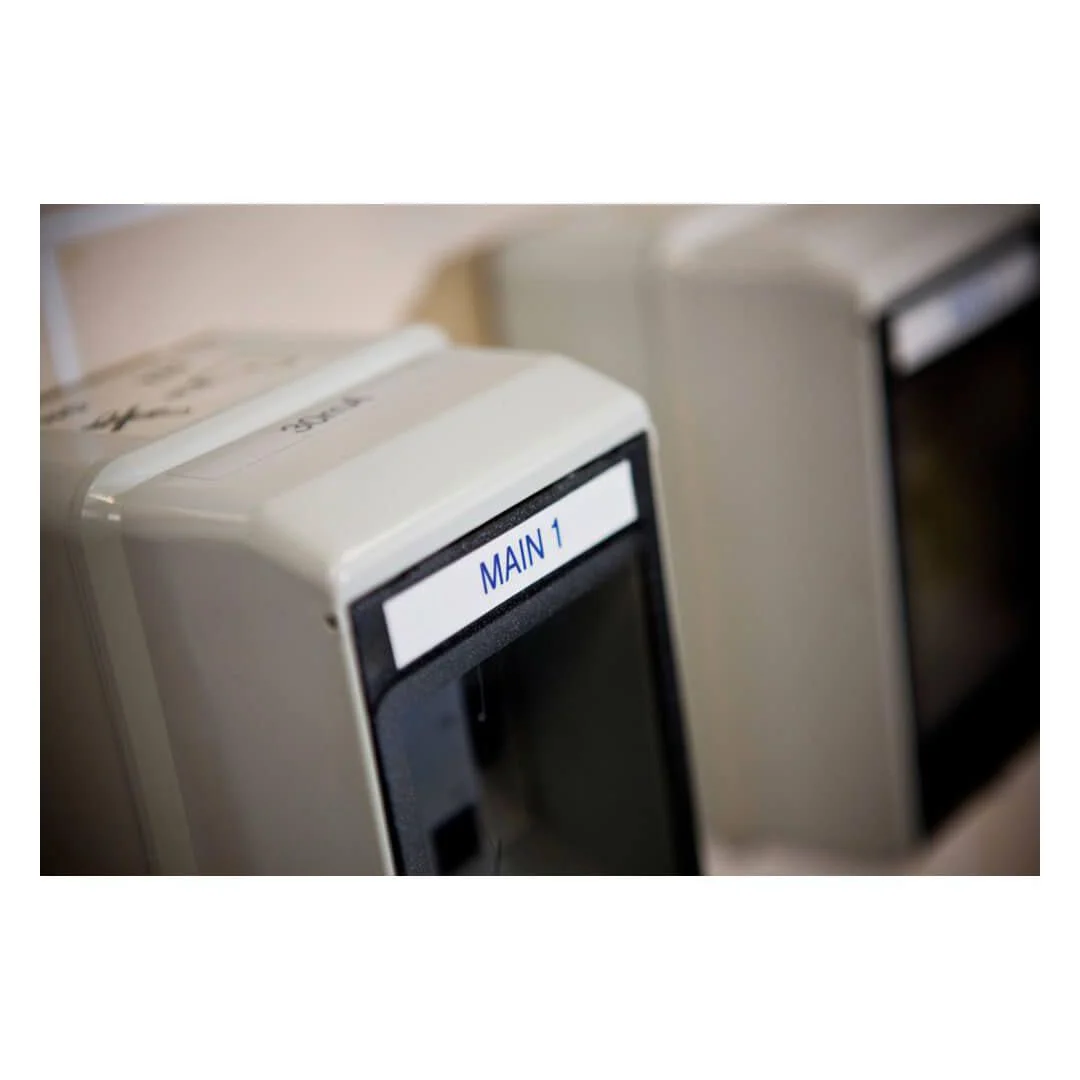 Lager hvite etiketter med blått trykk. Disse etikettene kan brukes både innendørs og utendørs under normale forhold, og er spesielt godt egnet for flate, jevne underlag.