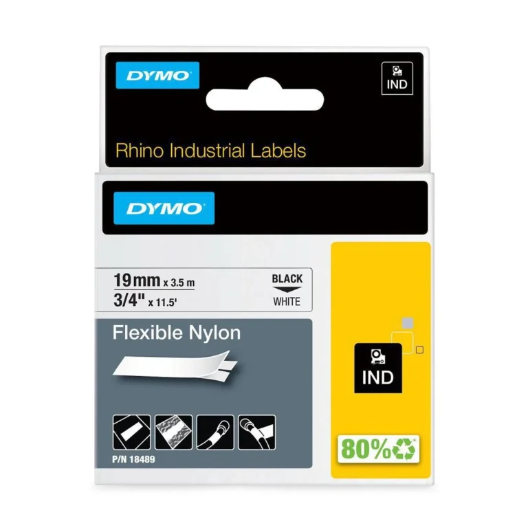 Den permanente DYMO® Rhino-polyesterkassetten på 19 mm inneholder kraftig polyesterteip i sort og hvitt. Gir robuste etiketter som varer lenge. Perfekt til bruk innendørs og utendørs for merking av beholdere, paneler, bjelker eller hyller. Rhino-etikettene viser tekst som skrives ut ved hjelp av varmeoverføringsteknologi, noe som fjerner behovet for blekk og toner.