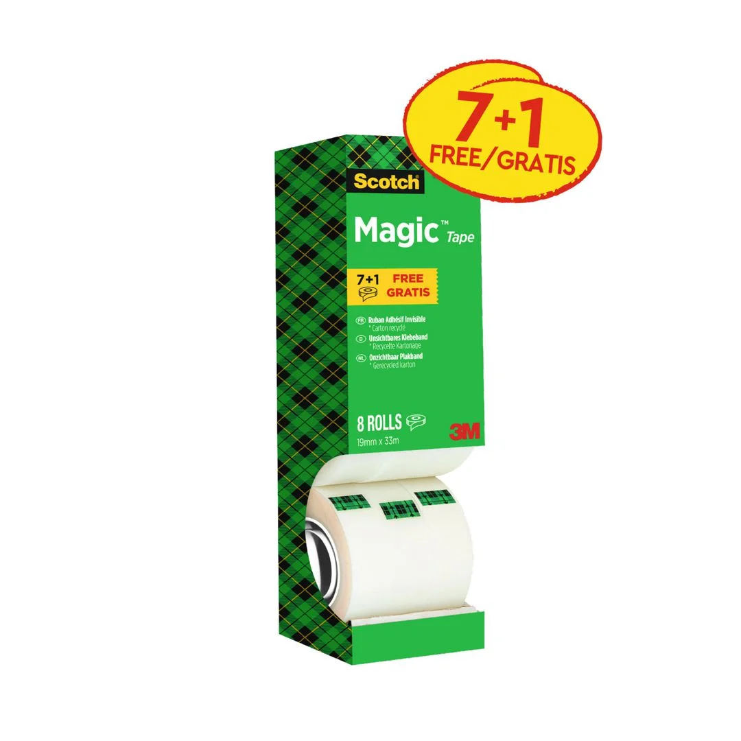 Med de mange bruksområdene som festemiddel og etikett er den usynlige Scotch® Magic™-teipen et populært valg for bruk hjemme og på kontoret. Scotch® Magic™-teipen er klar når den påføres og er en god løsning for å reparere papirrifter i bøker eller andre viktige papirprodukter. Den jevne og matte overflaten gjør at den også er lite synlig på fotokopier. Denne gjennomsiktige teipen av høy kvalitet kan brukes til å teipe papp, feste papir eller pakke inn små pakker.