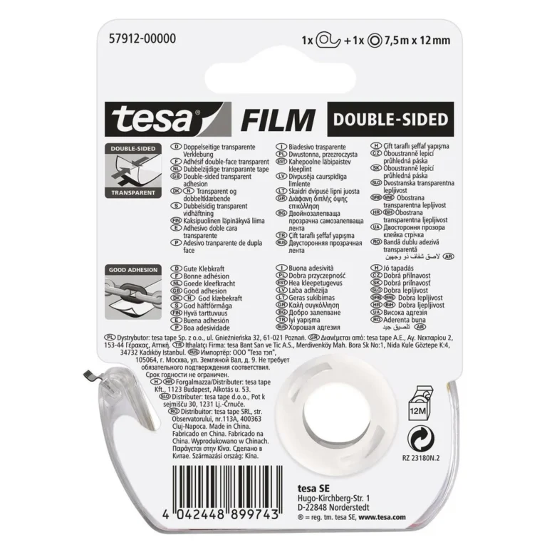 Den dobbeltsidige tesafilm®-teipen har lim på begge sider for å feste papir eller papp sammen. Denne klare dobbeltsidige tesa®-teipen har lim på begge sider og leveres i en praktisk hånddispenser for enkel og rask bruk.