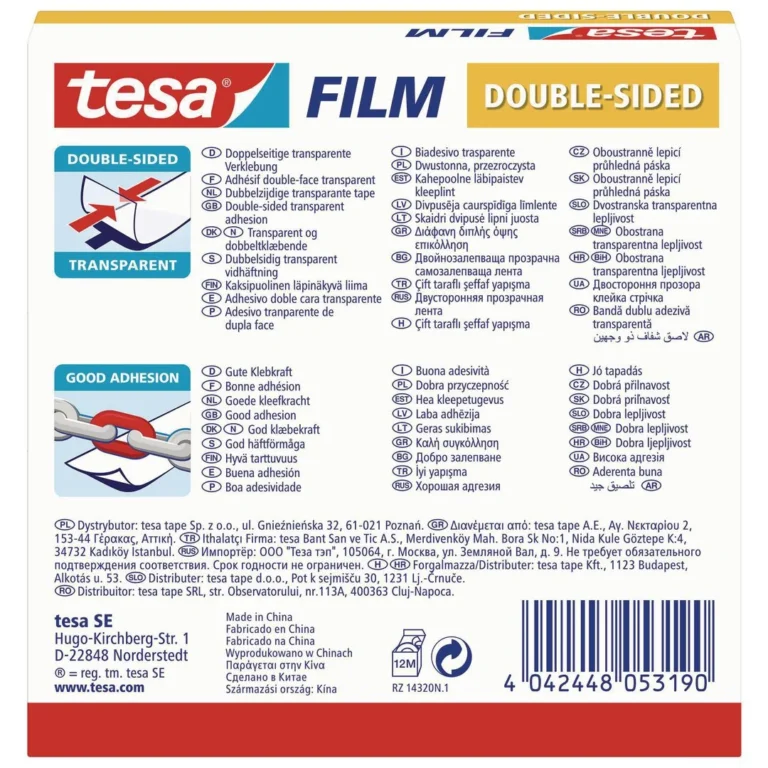 tesafilm® dobbeltsidig selvklebende tape passende for mange forskjellige bruksområder som krever diskret festing, fiksering og liming av papir eller kartong. Den gjennomsiktige tapen er fri for PVC og løsemidler.