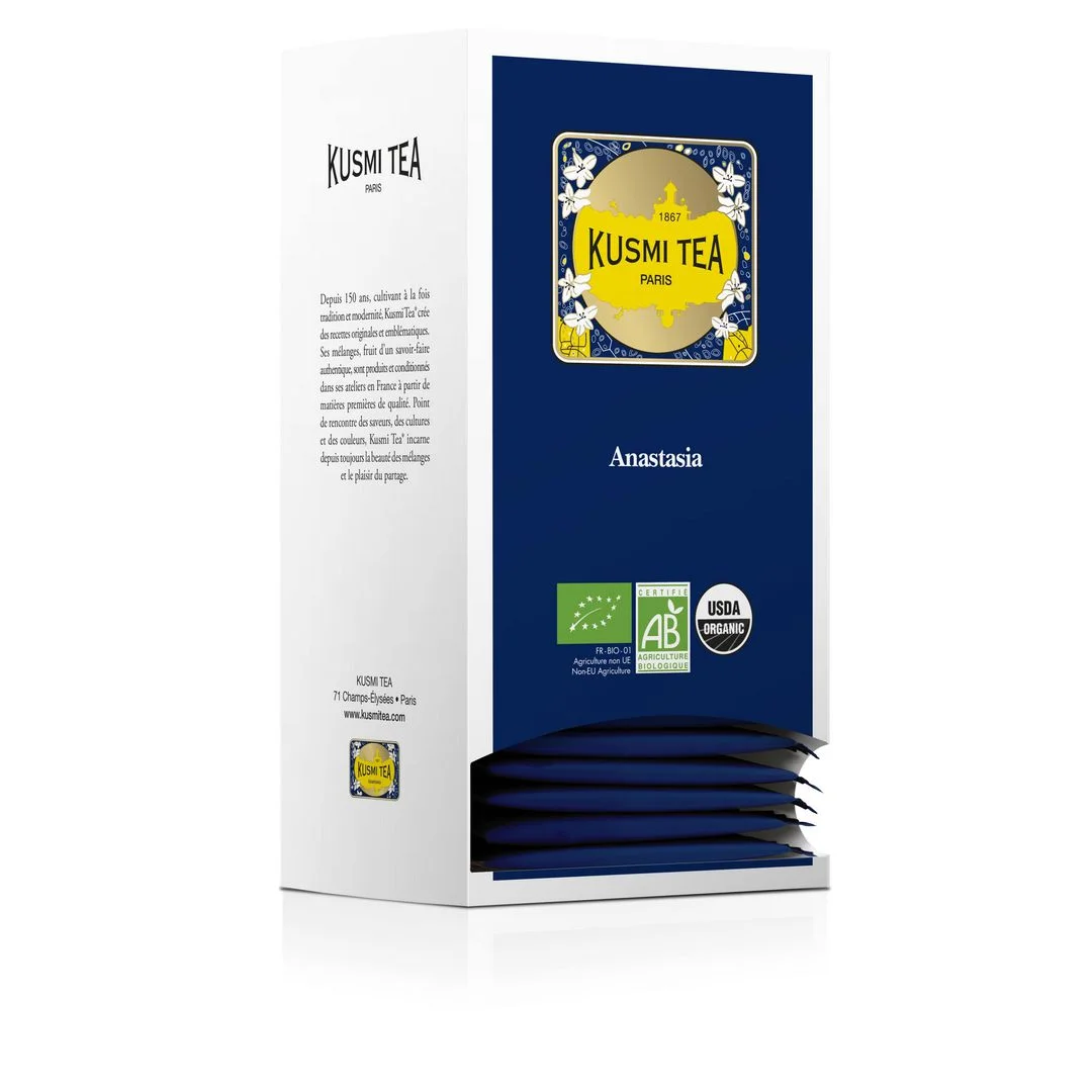 Økologisk te fra Kusmi Tea, kjent for sine aromatiske teblandinger. Anastasia er en av de mest kjente variantene fra Kusmi te, en ekstra smakfull variant av Earl Grey. Sort te med bergamot, sitron og appelsinblomst. I over 150 år har Kusmi Tea dyrket både tradisjon og modernitet, samtidig som de har skapt originale og ikoniske oppskrifter.