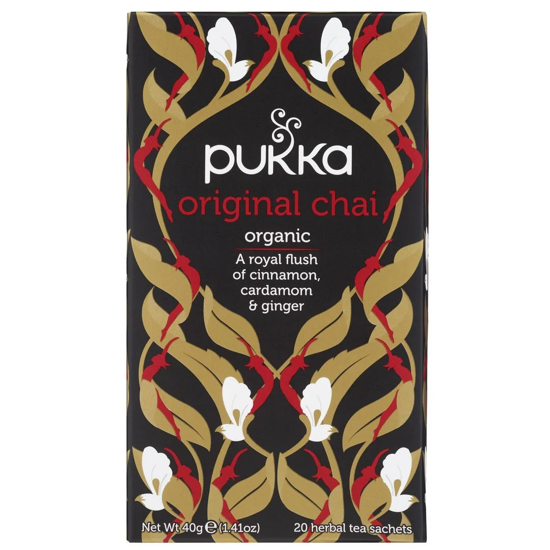 Pukka chai-te er en bukett av varme fra ingefær og kanel, samt krydret kardemomme som er blandet inn i sort te og smaksatt med lakris.