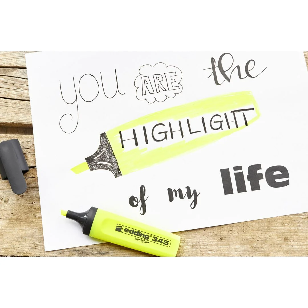 Både teksten og merkingen synes ved kopiering. Edding 345-tekstmarker har en skråskåret spiss med en strekbredde på 2–5 mm og passer utmerket til oppgaver som krever fet og frittflytende skrift. Vannbasert blekk gir dype farger Kan skrive på nesten alt slags papir.
