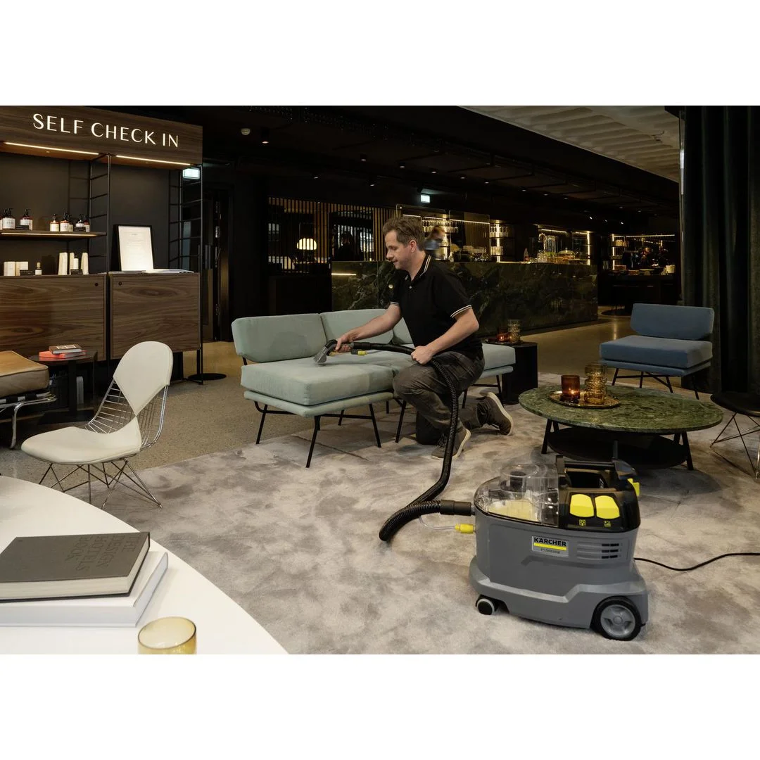 En robust, slitesterk og effektiv møbel- og tepperenser som renser møbeltrekk og fjerner flekker fra tekstiloverflater med hygienisk rengjøringsresultat og høy effektivitet. Den kompakte maskinen sprayer rengjøringsløsningen dypt inn i tekstilfibrene og fjerner den deretter igjen sammen med løsnet skitt. Den utmerkede oppsugingsytelsen sørger også for rask tørking og gjør at tekstiloverflatene raskt kan brukes igjen – ideelt for de høye kravene til rengjøringspersonell i hotellsektoren eller innen rengjøring av kjøretøy. Det ekstra korte møbelmunnstykket for praktisk, ergonomisk rengjøring av trange områder følger med som standard. Den svært lave vekten og det ergonomiske bærehåndtaket gjør maskinen enkel å frakte med seg.