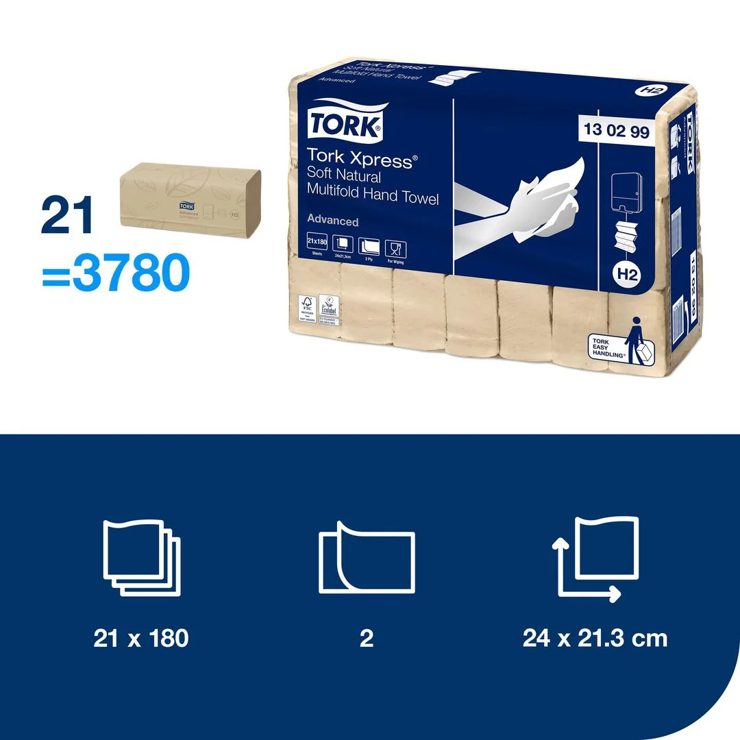 Tilby gode håndtørkemuligheter og komfort til gjestene dine med Tork Xpress® Myk Multifold Håndtørk Advanced. Håndtørkene er skånsomme mot hendene, av høy kvalitet og passer i Tork Xpress®. Papiret er laget av 100 % resirkulert papirfiber og har den samme gode papirkvaliteten fra Tork.
