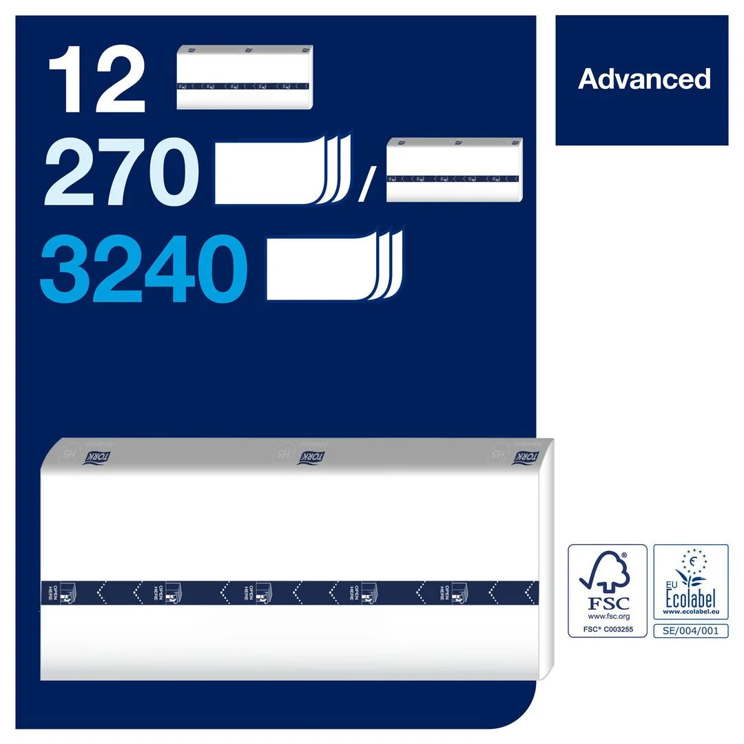 Tork PeakServe Advanced er 1-lags mykt håndtørkepapir for H5 høykapasitetsdispensere.