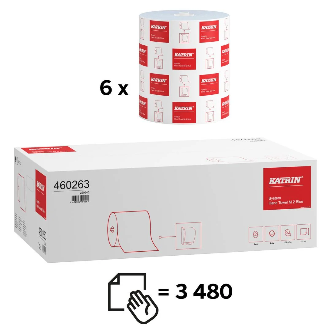 Blått tørkepapir med høy absorberingsevne som er ideelt for høy besøksfrekvens. Spesielt egnet for mathåndtering, hvor den blå fargen gir sporbarhet. Katrin System Håndtørkepapir M2 blå er et papir med høy absorpsjonsevne som passer til effektiv tørking.