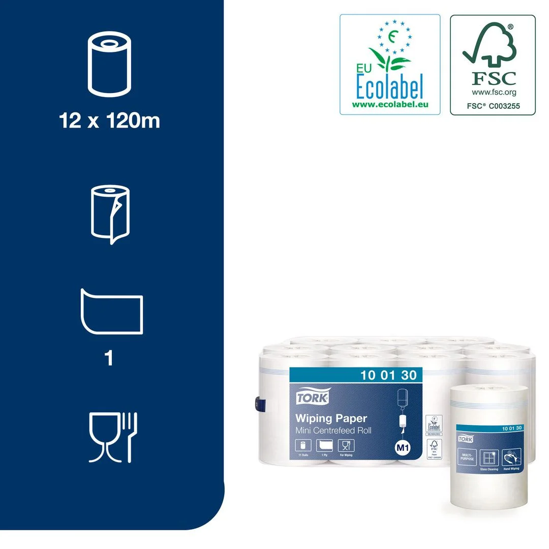 Tork Mini M1 tørkepapir føles myke og har enestående rengjøringskapasitet, det egner seg spesielt godt for rengjøring av glass og glassoverflater. Du kan tydelig se resultatet når dette tørkepapiret som er enkelt å bruke, håndtere og kaste, brukes på speil. Mykt, slitesterkt og absorberende Spesielt egnet for rengjøring av glass Kompatibelt med Tork M1 sentertrekksystem Godkjent for kortvarig kontakt med matvarer.