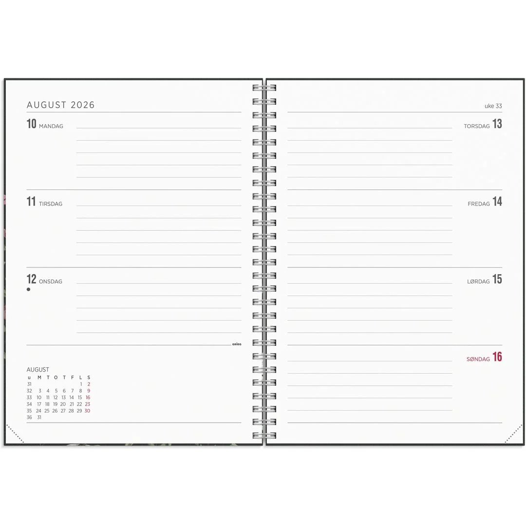 Det kompakte designet skjuler en romslig kalender med plass til alt du trenger å notere. Med sølvfarget spiral og elegant preget årstall er dette en kalender som kombinerer stil og funksjon.