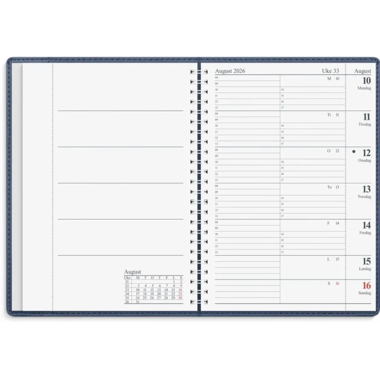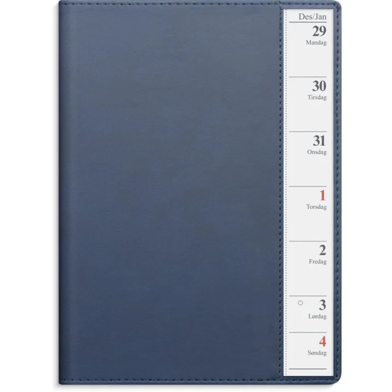 Spiralisert ukekalender med blått imitert skinnomslag. Med hele uken plassert på høyre side i kalenderen og notatside til dine ukentlige notater på venstre side.