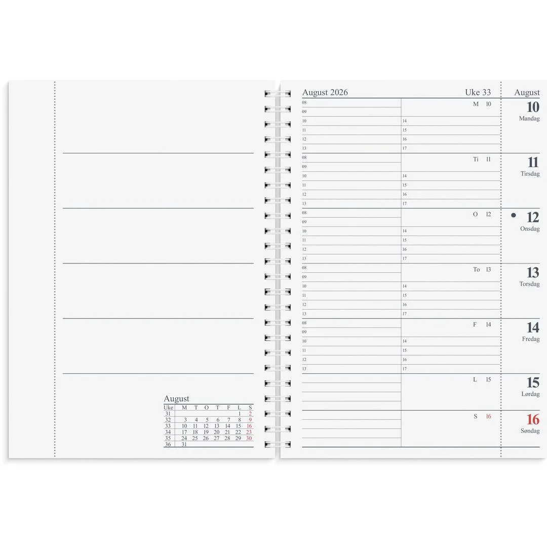 Spiralisert ukekalender med hele uken plassert på høyre side i kalenderen og notatside til dine ukentlige notater på venstre side.