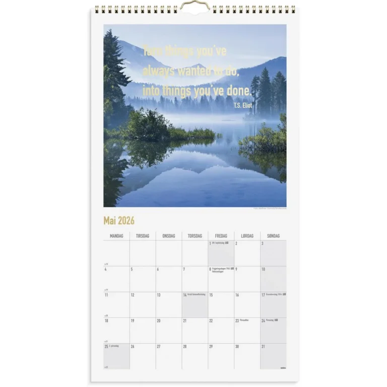Planlegg månedens gjøremål, og nyt naturbildene og de tankevekkende sitatene preget i gullfolie. Kalenderen gir deg et godt overblikk og letter planleggingen. Opphengsbøyle gjør det enkelt å henge den på veggen. Kalenderen er miljømerket FSC®, som betyr at hele produktet er produsert med papir og annet trevirke fra et ansvarlig og bærekraftig skogsbruk.