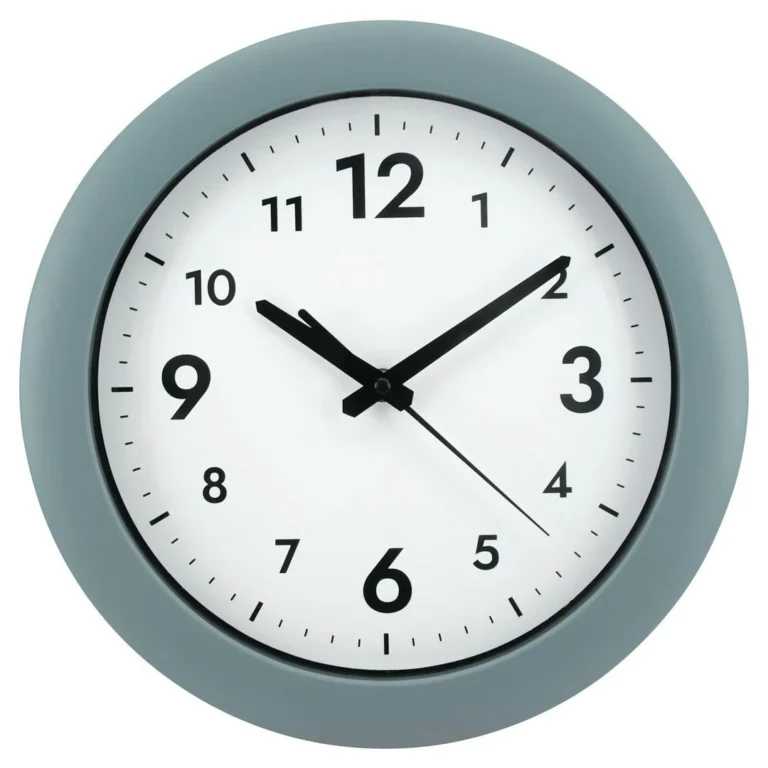 Klokken har store tall, sort sekundviser og kvartsurverk.