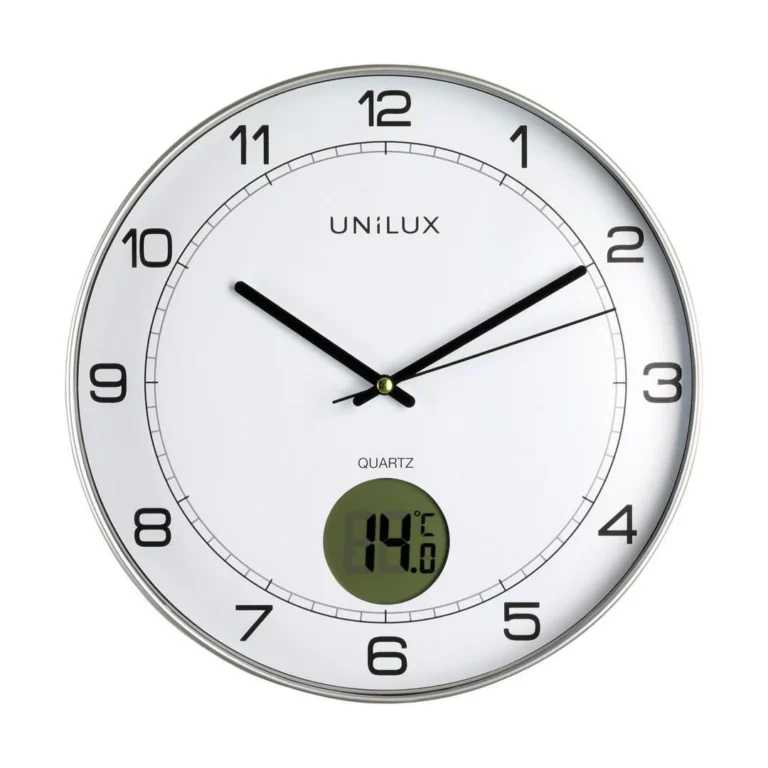 Tid og temperatur i ett – for et komfortabelt arbeidsmiljø! Unilux Tempus er et stilrent veggur med integrert digitalt termometer , som gir deg både tid og temperatur i sanntid. Med en diameter på 30, 5 cm og tydelige tall, kan klokken enkelt leses fra opptil 35 meters avstand.