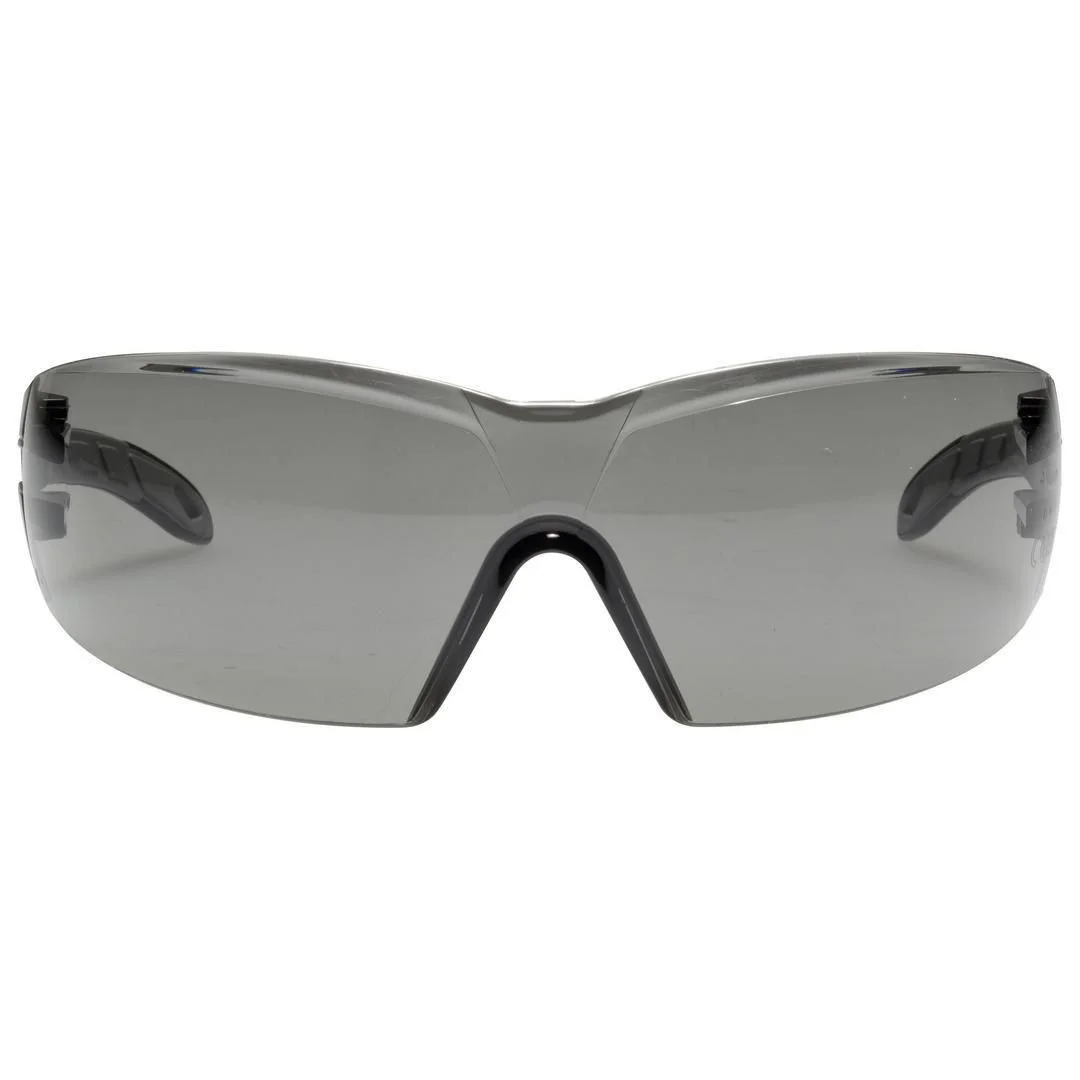 De buede linsene beskytter øyenbrynene og nedre panne. De smale brillestengene gjør det behagelig å bruke både hørselvern, hjelm og støtbeskyttelseshetter. Ripebestanig Antidugg på begge sider 100% metal-free PC linse i grått 23% Kjemikaliebestandig på utsiden Godkjent i henhold til EN 166 (personlig øyevern) og EN 172 (solskinnfiltre for industriell bruk) CE sertifisert: W 166 F CE – 5-2. 5 W 1 FKN CE UV-filter.