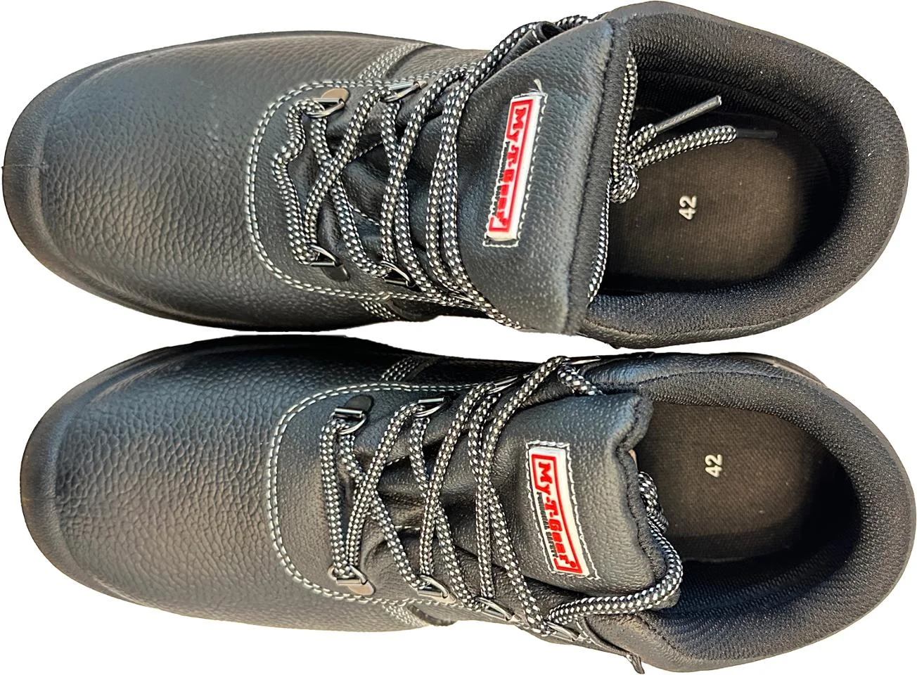 My-T-Gear T-Start S3 er en robust og stabil verneskolett utviklet for krevende arbeidsmiljøer. Her får du ekstra ankelstøtte, solid beskyttelse og høy komfort gjennom hele arbeidsdagen – perfekt for industri, bygg, utendørs arbeid og verksted. Den kraftige ståltåhetten beskytter mot opptil 1500 kg trykk og 20 kg fallende gjenstander, mens spikertrampbeskyttelsen (P) tåler 1100 Newton og sikrer trygghet mot spisse gjenstander under foten. Det vannavstøtende overlæret (WRU) og den integrerte vanntette membranen holder føttene tørre selv i våte og krevende arbeidsforhold. Den ergonomiske passformen og støtdempende hælen reduserer belastningen på muskler og ledd når du står og går mye. Den lukkede hælkappen gir stabilitet, mens den slitesterke PU/PU-yttersålen sørger for optimal sklisikkerhet – sertifisert for sikkert grep på både våte og oljete underlag. Det pustende og slitesterke læret bidrar til et komfortabelt og tørt klima i skoen gjennom hele dagen. – Robust og høy verneskolett med ståltåhette – Pustende og slitesterkt lær for komfort hele dagen – Tåler 1500 kg trykk og 20 kg fallende last – Spikertrampbeskyttelse P, motstår 1100 N – WRU-vannavvisende overdel holder føttene tørre – Ergonomisk design med støtdempende hæl – PU/PU-yttersåle med maksimal sklisikkerhet (SRC) – Sertifiseringer: EN ISO 20345:2011 S3 SRC (verneskolett), ESD-godkjent: EN 61340-4-3:2002 Class 1 – Farge: Sort
