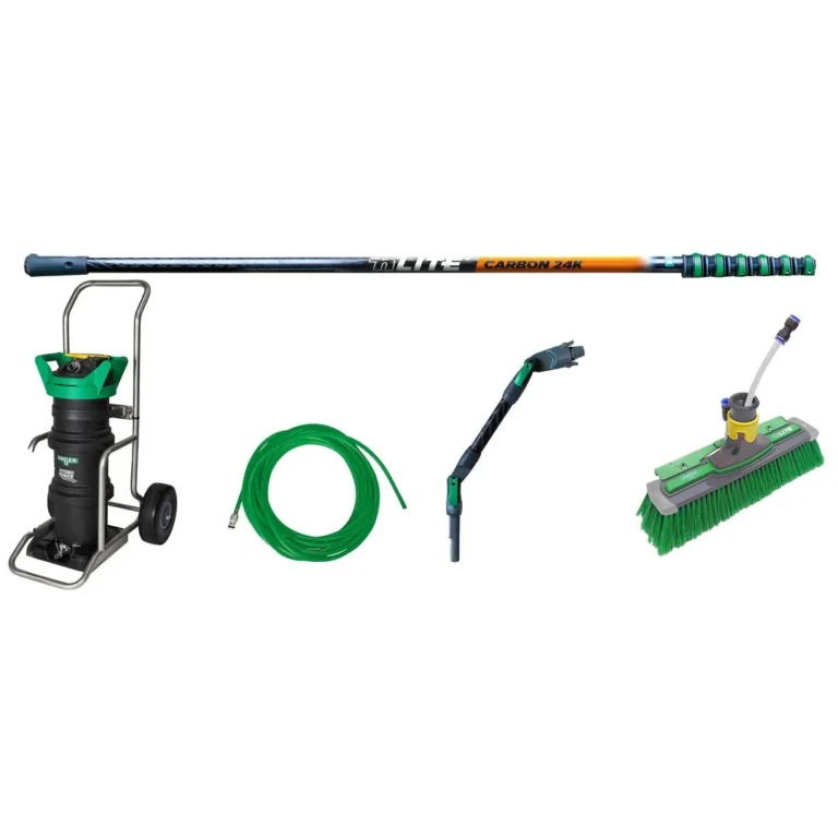 Vannet går gjennom filtre i Hydro Power Ultra-enheten og kommer ut helt fri for mineraler som kan gi flekker og striper på vinduet. Dette er et avansert komplett alt-i-en kit med skaft i karbon. Følgende er inkludert: HydroPower renseenhet Ultra filter størrelse L med tralle HydroPower renseenhet Ultra filter LC 1 karbonskaft 24K skaft for renhold opptil 8,6 meter Vinkel adapter str M, 42 cm Børste 28 cm Slange 25 meter Det er mulig med påbygging av ekstra 3,2 meter med L-CF33G Unger Karbon 24K forlengerskaft.