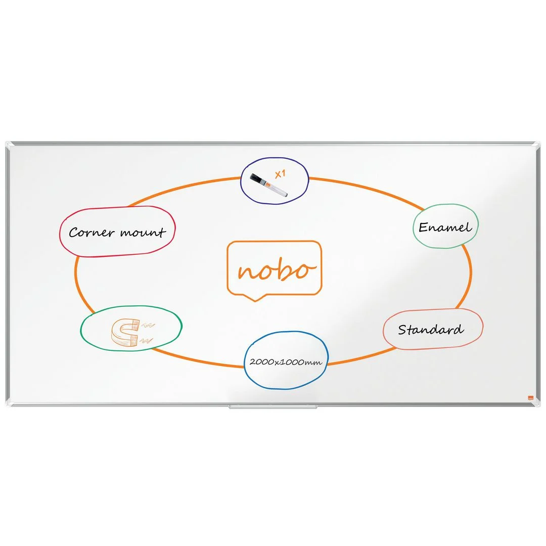 Emaljert, magnetisk overflate som har overlegent nivå av avtørking ved hyppig brukStørrelse: 200x100cmModerne og smal aluminiumsrammeHenges opp med tradisjonell hjørneopphengRomslig pennehylle for oppbevaring av whiteboardpenner og pusseklossLeveres med en Nobo whiteboardpenn25 års garanti på overflaten.